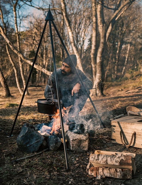 Stor Tripod XL för utomhusanvändning. Placeras över ett stort eldfat eller direkt över öppen eld. 4 st kättingar med krokar ingår för att hänga gryta eller galler i.