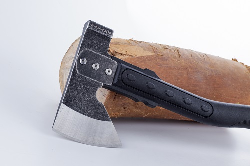 Vildmarksyxa i serien Satake Outdoor. Yxan har en hammare på klacken och kraftigt skaft i glasfiber med specialgrepp för att spänta tändved och annat finlir.