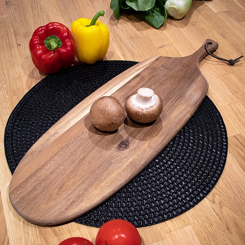 Servering/skärbräda i vacker naturlig form av ett löv. Lämplig som både skärbräda och serveringsbräda. Servera dina gäster en läcker tapasbuffé på den långa brädan eller varför inte en rykande, väldoftande och nygräddad pizza på den bredare brädan.