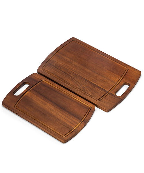 2-pack skärbrädor i vackert acaciaträ från Orrefors Jernverk. Skärbrädor av trä är definitivt ett måste i köket och passar både till att hacka grönsaker på som att ställa på bordet efter att du har grillat. Skärbrädorna har ett rejält handtag i kortändan och en skåra ovanpå som samlar upp vätska. Dessa skärbrädor är lätt att lyfta då det är tillverkade av akaciaträ som dessutom ger dem vacker skiftning och lyster. Information Vårda din skärbräda väl så håller den i många år framöver. Oljas in när den ser torr ut, fått ljusa fläckar eller efter en djuprengörning. Diska ej i maskin Passar bra att profilera