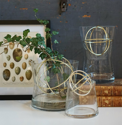enkelt håller blommorna på plats. Vasen finns i tre olika storlekar och man kan välja mellan stål, guld och kopparfärg på placeringskulan.