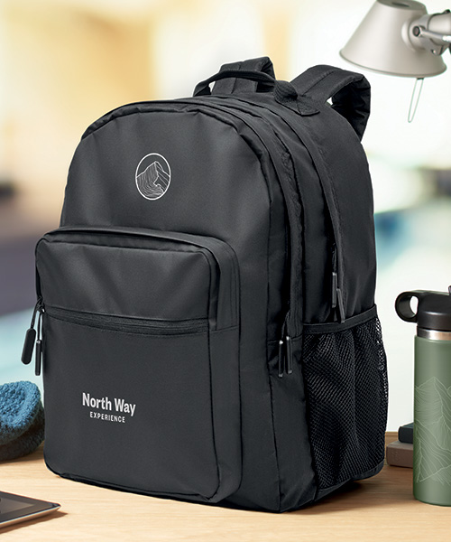 Dataryggsäck för 15 tums datorer. Gjord i 300D RPET polyester. Den har 2 stora fack med dragkedja, dubbla framfickor med dragkedja och sidoficka med meshnät. Vadderade rygg- och axelremmar.
