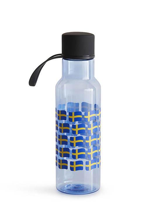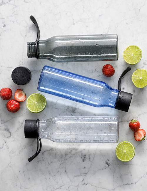 Stilren och praktisk vattenflaska gjord i BPA-fri tritanplast. Locket är av rostfritt stål täckt i svart gummi för bra grepp när du ska öppna flaskan. Öglan gör det möjligt att till exempel hänga flaskan på träningsväskan. Gör flaskan extra snygg med ditt tryck på!