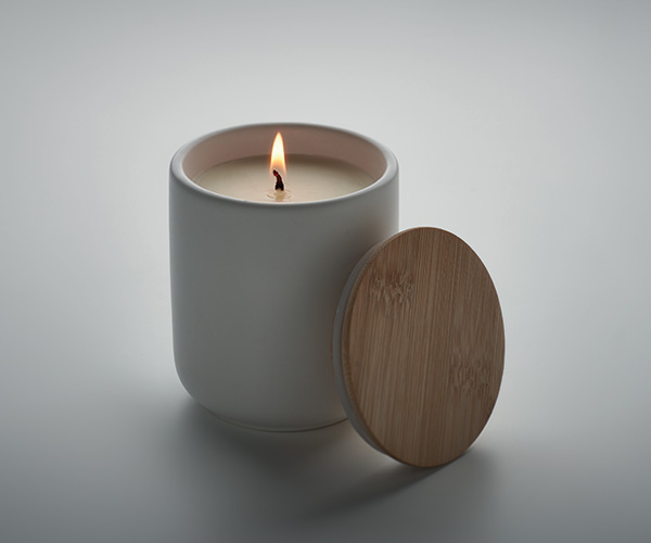 Doftat växtbaserat vaxljus i behållare i stengods med bambulock. Doft Linne, 200 gr. Brinntid: 36 timmar.